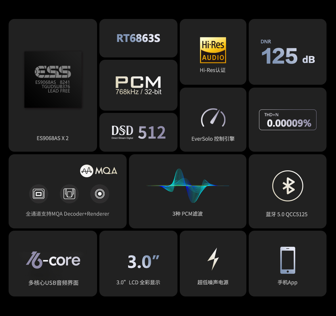 最高支持DSD512 Native、PCM768Hz@32Bit解码