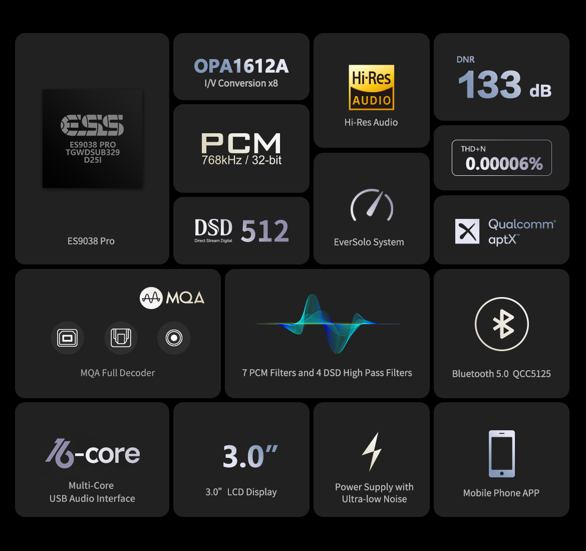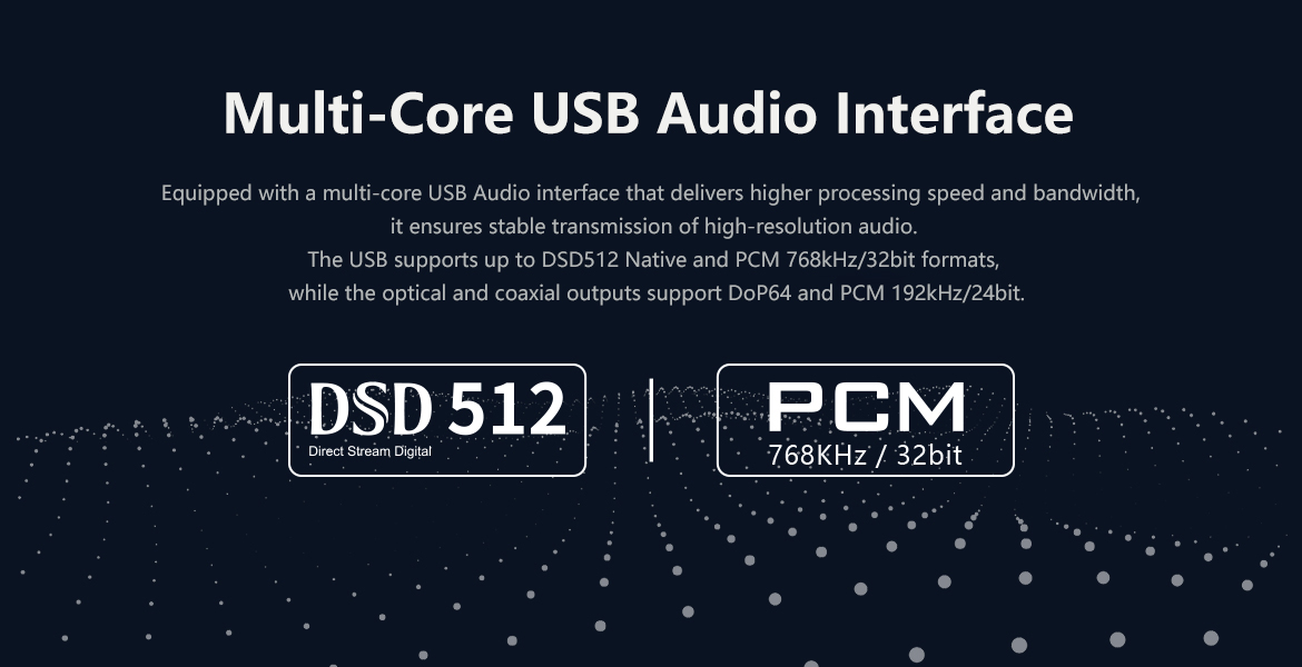 Up to DSD512 Native, PCM768KHz@32Bit decoding.