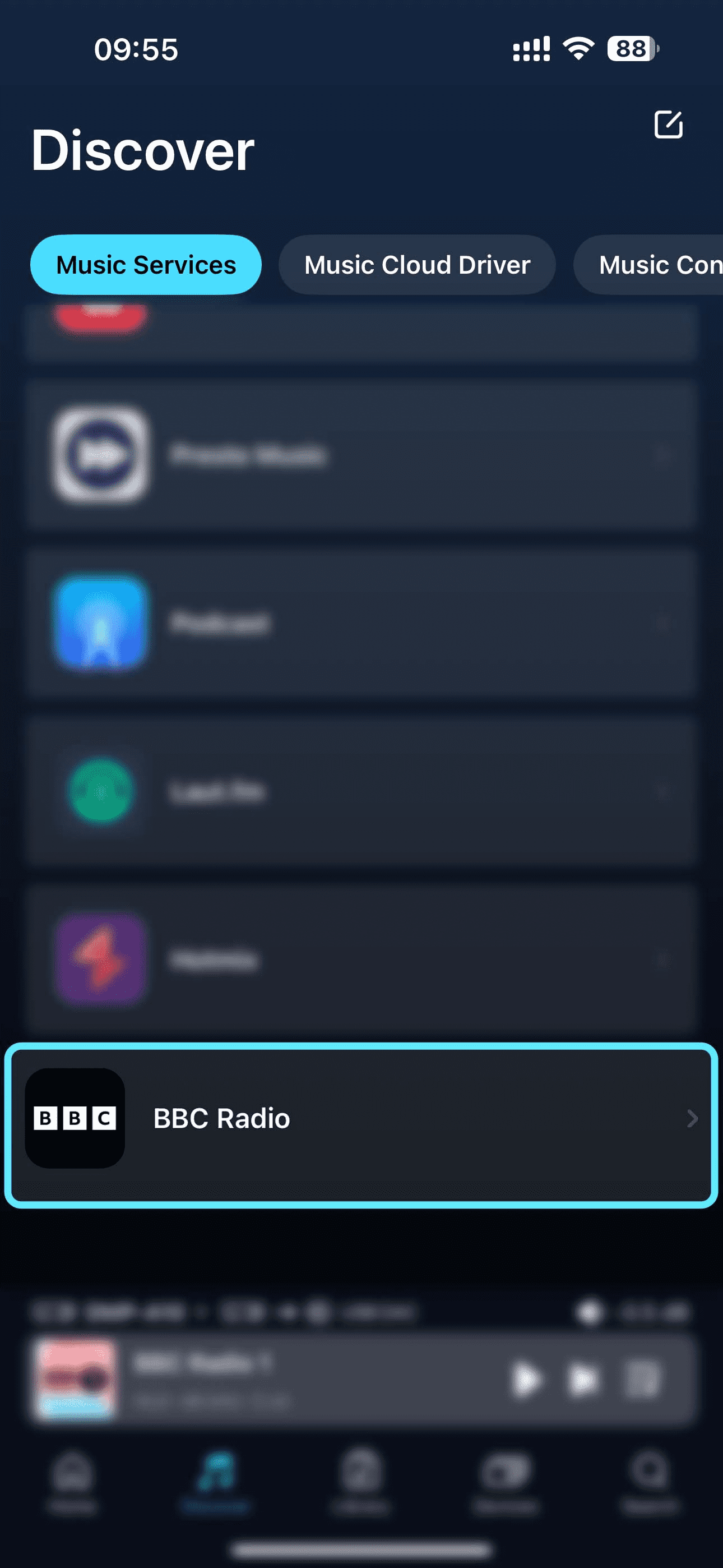 Open BBC Radio on your device under "Streaming" - "Music", or open it in the Eversolo Control app under "Discover" - "Music Services". No account is required to use this service.