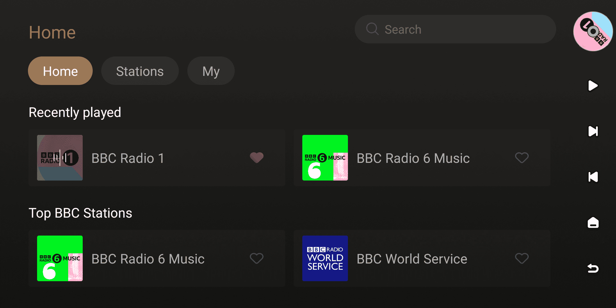 Browse BBC Radio content on your device or the Eversolo Control app. The main interface offers sections for Home, Stations, and My.