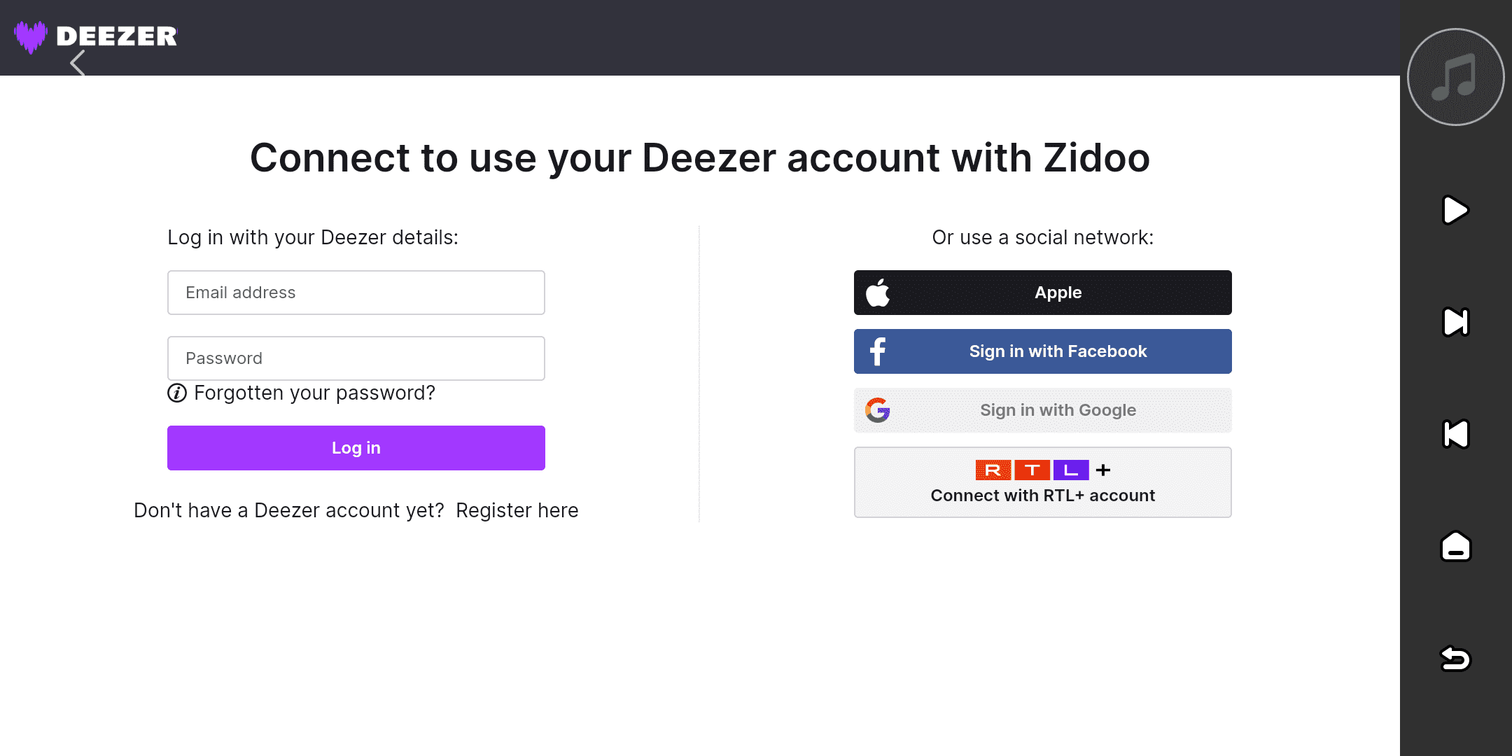 If you haven't created a Deezer account yet, please click ''Register here'' on the device and follow the prompts to complete account registration.