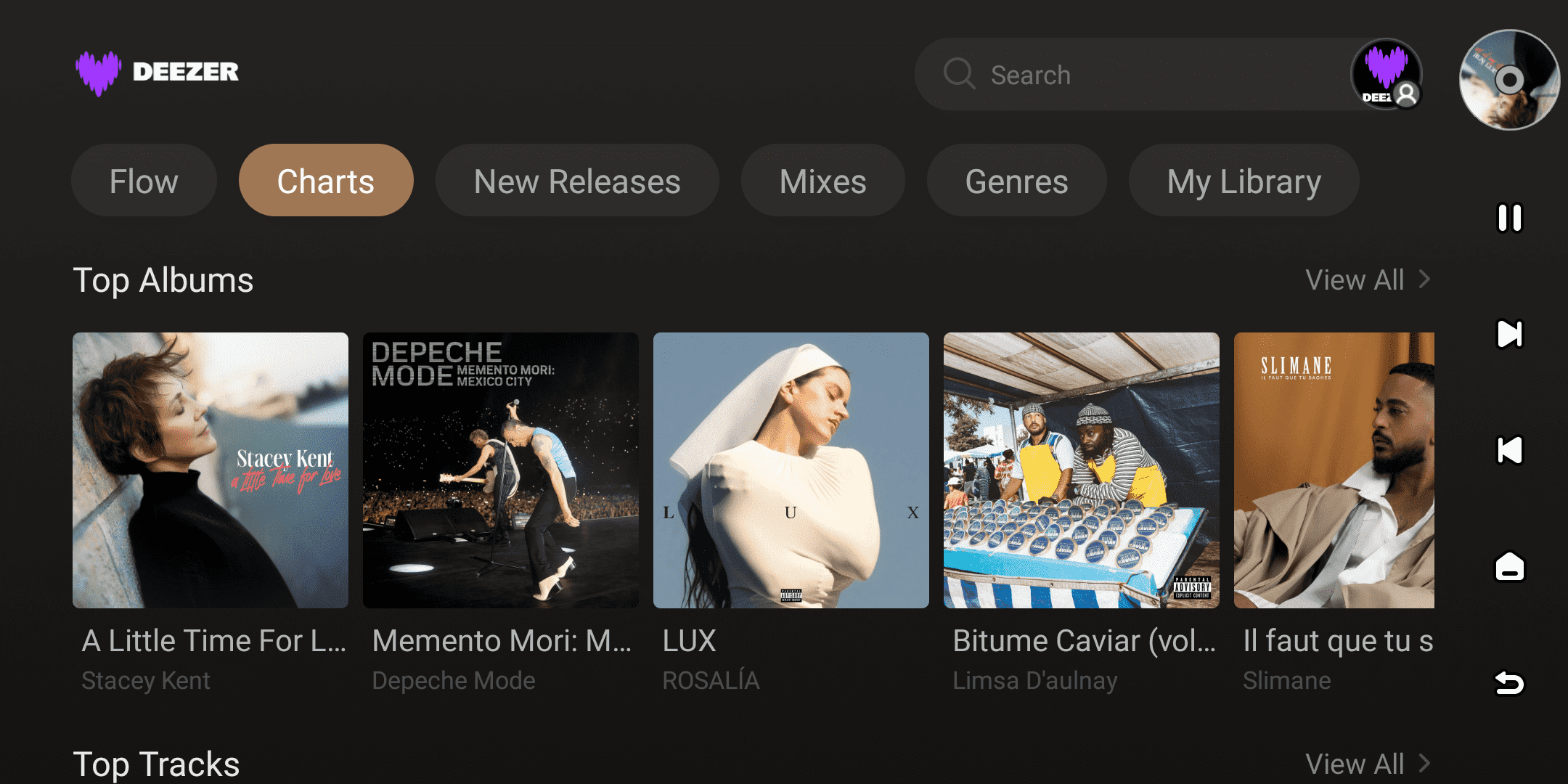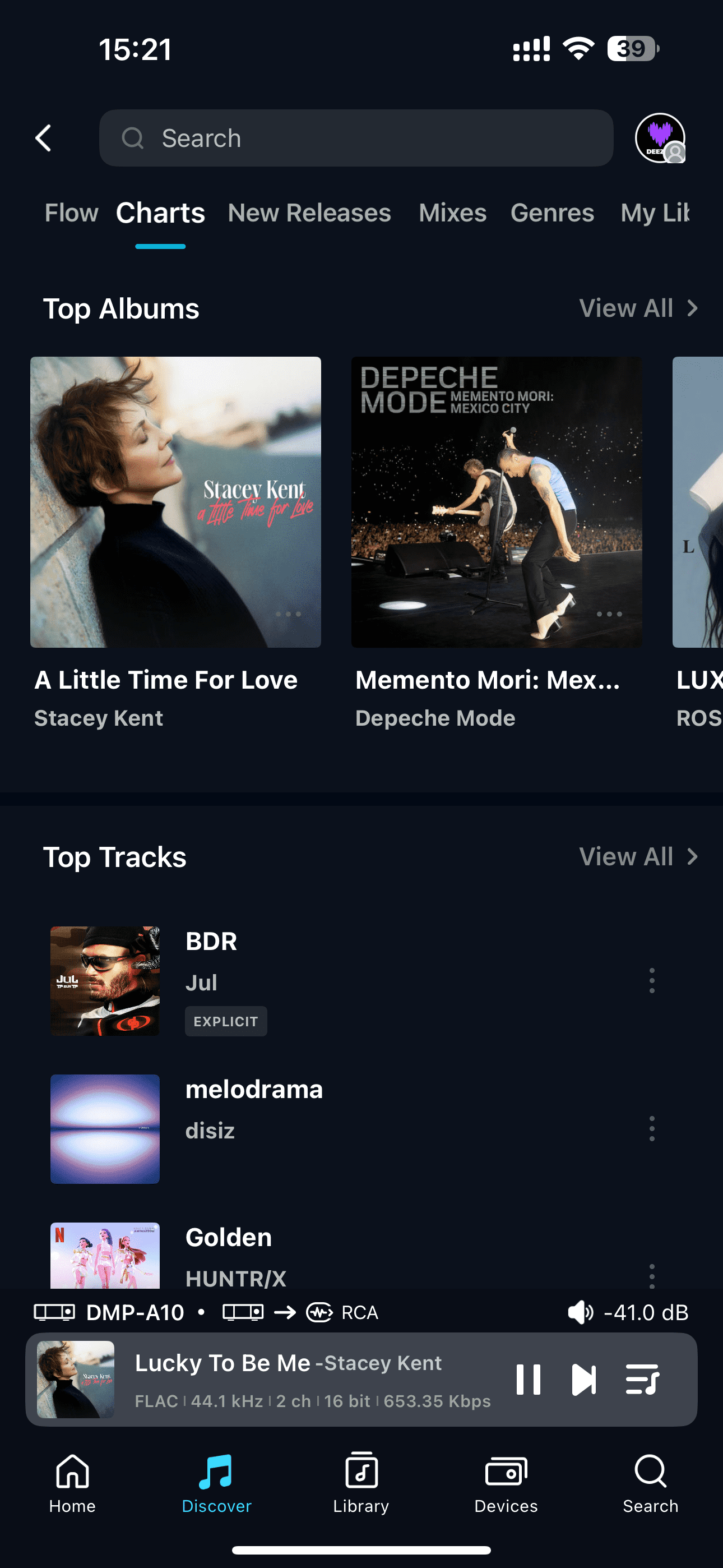 After successfully logging in, you can browse Deezer music on your device or the Eversolo Control APP. At the top of the interface, you will see sections for Flow, Charts, New Releases, Mixes, Genres, My Library.
