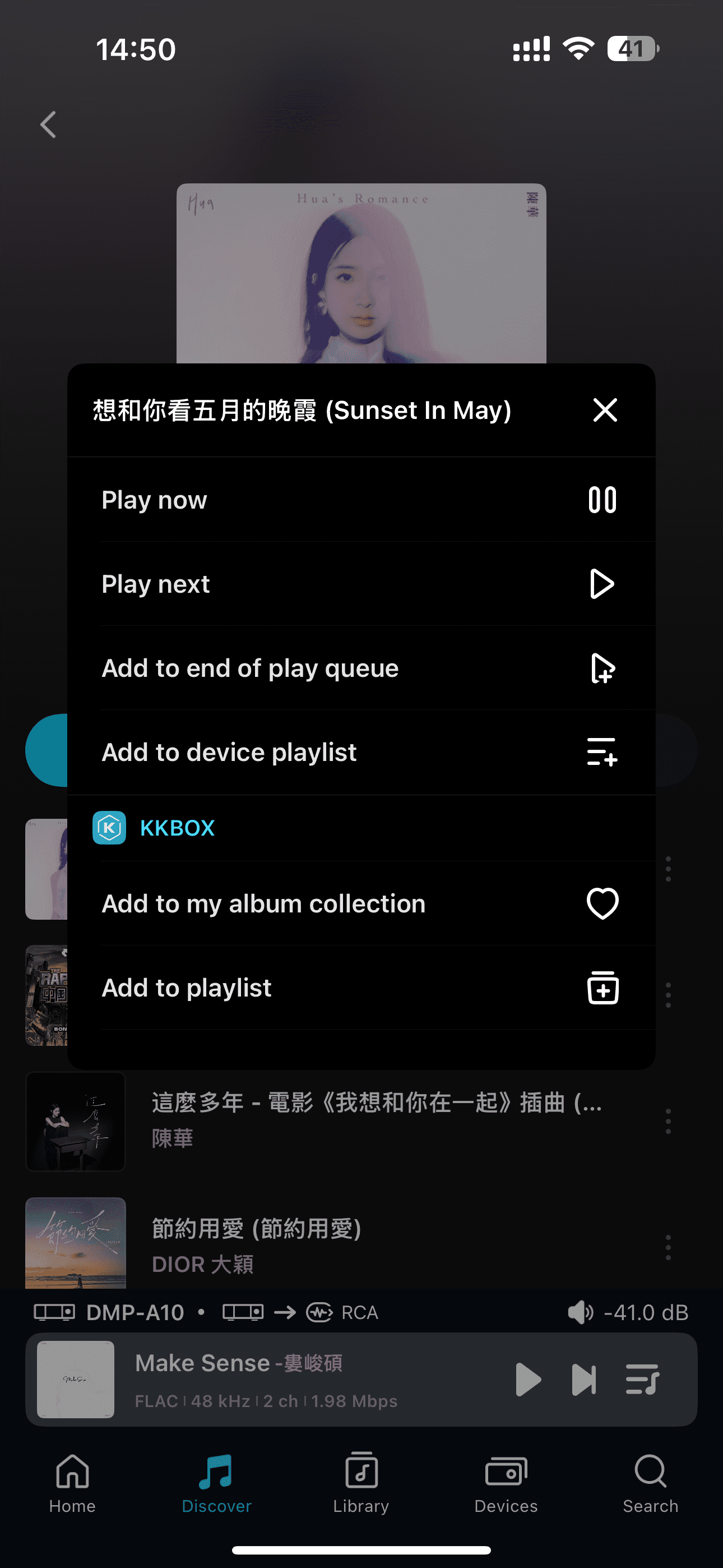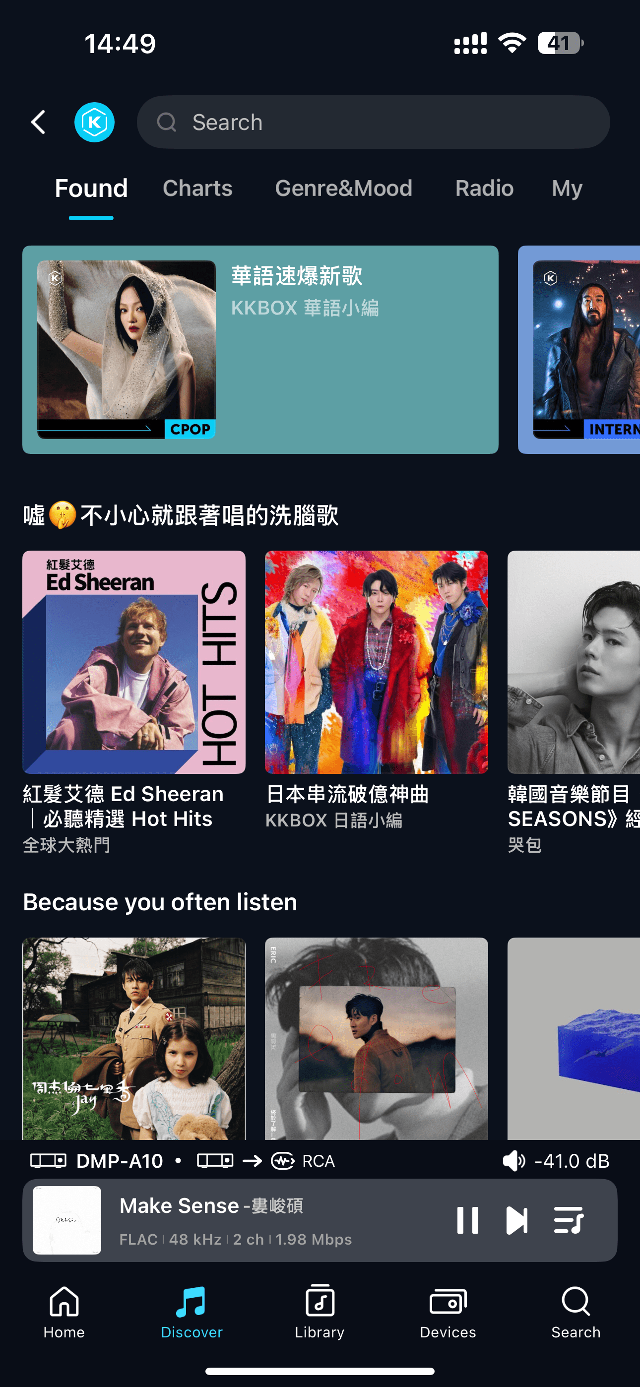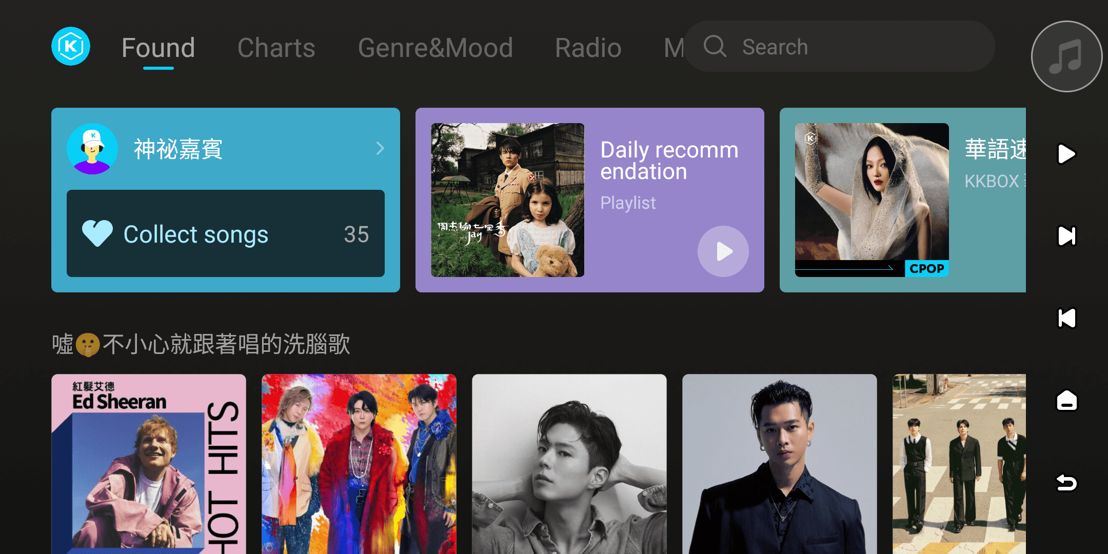 After successfully logging in, you can browse KKBOX music on your device or the Eversolo Control APP. At the top of the interface, you will see sections for Found,Charts,Genre&Mood, Radio, and My.
