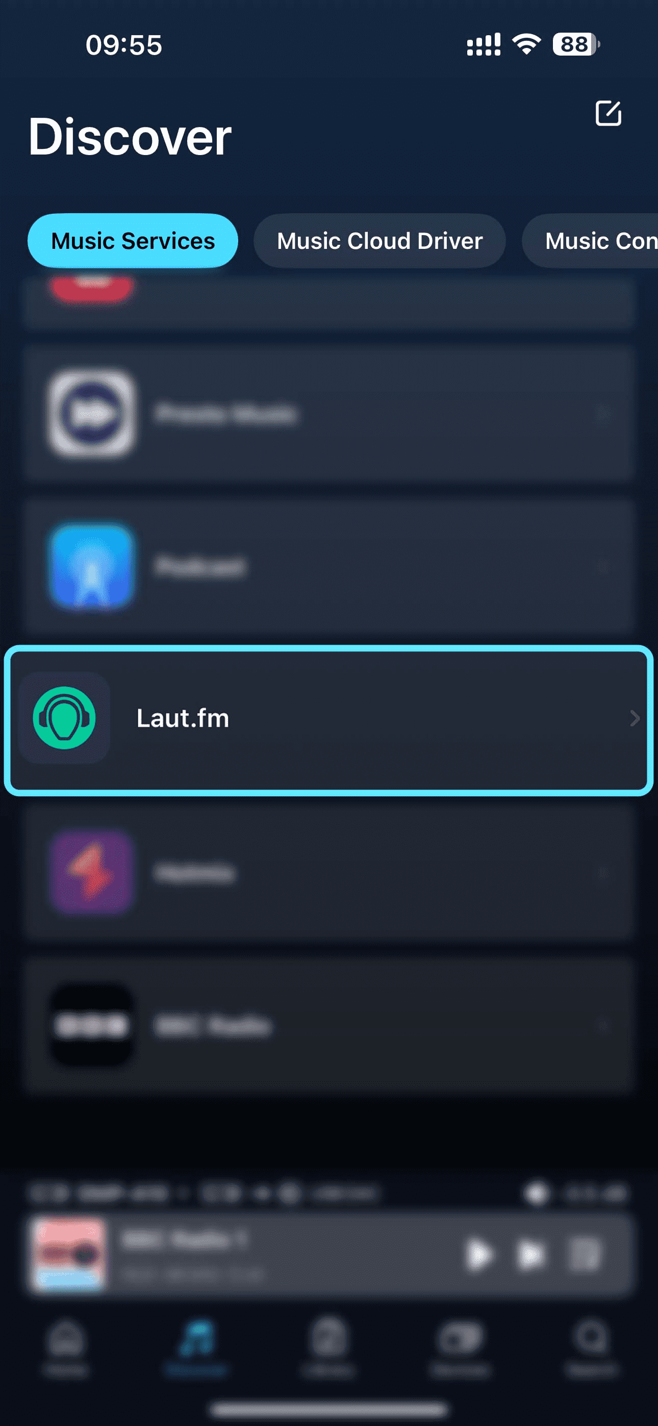 Open Laut.fm on your device under "Streaming" - "Music", or open it in the Eversolo Control app under "Discover" - "Music Services". No account is required to use this service.