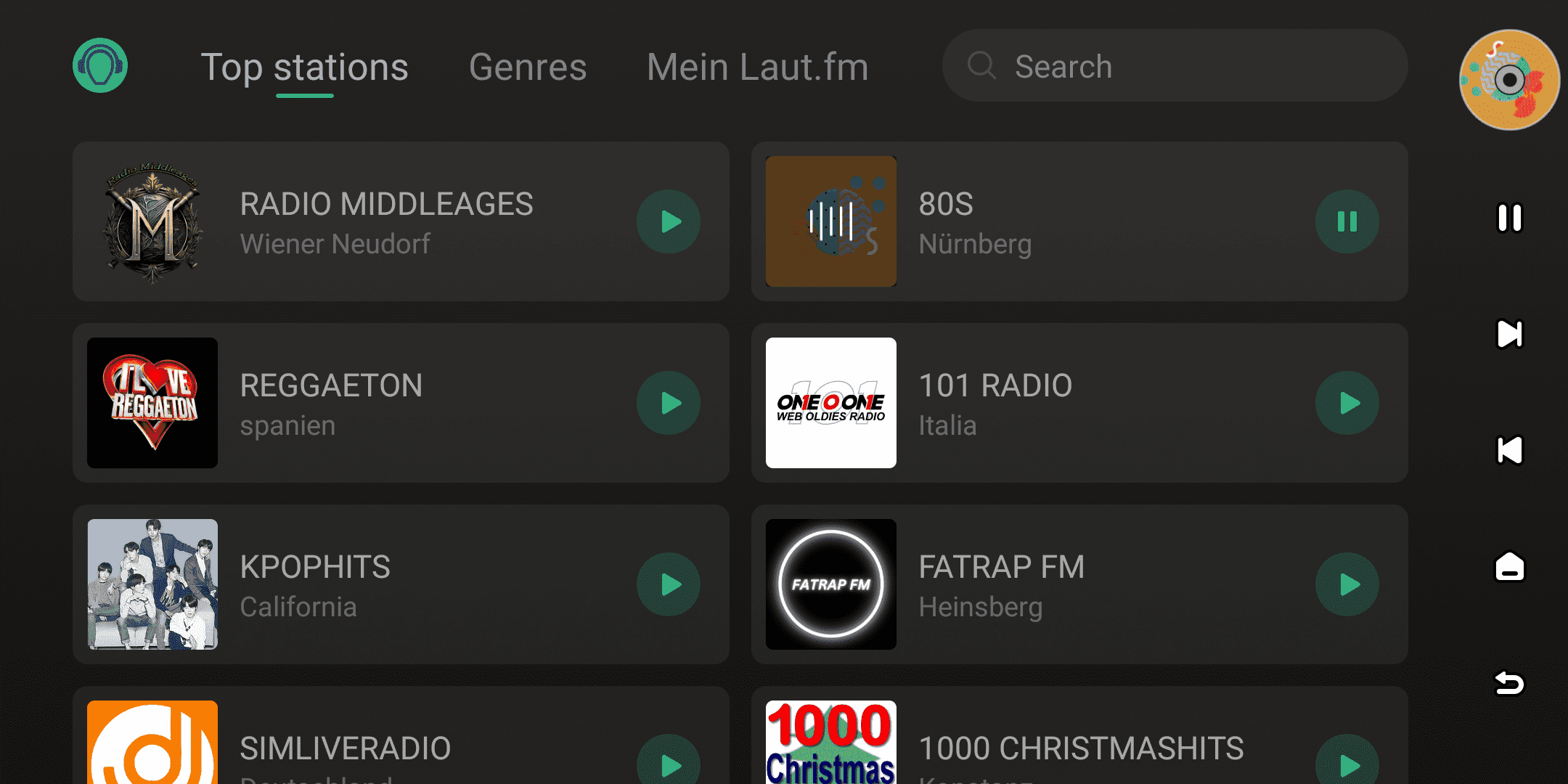 Users can select and listen to various radio programs of different styles in the "Top stations" section. Recent playback history and saved radio stations will be displayed together on the "Mine Laut.fm" page for easy viewing and management later.