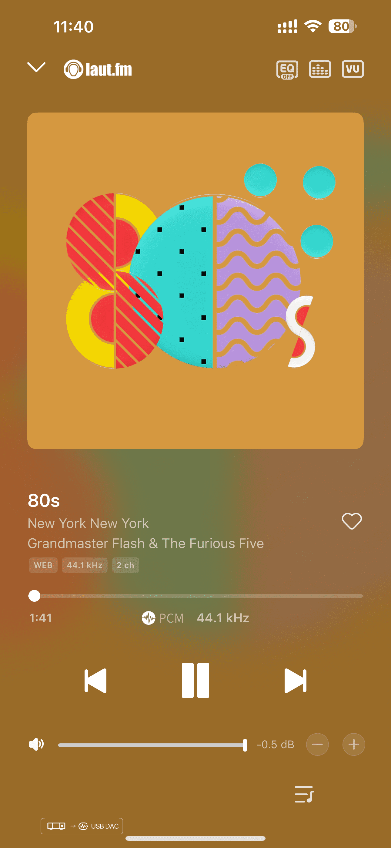 When using the Laut.fm service, the device will output directly according to the current audio source specifications.The actual audio quality depends on the original audio quality provided by the Laut.fm platform.