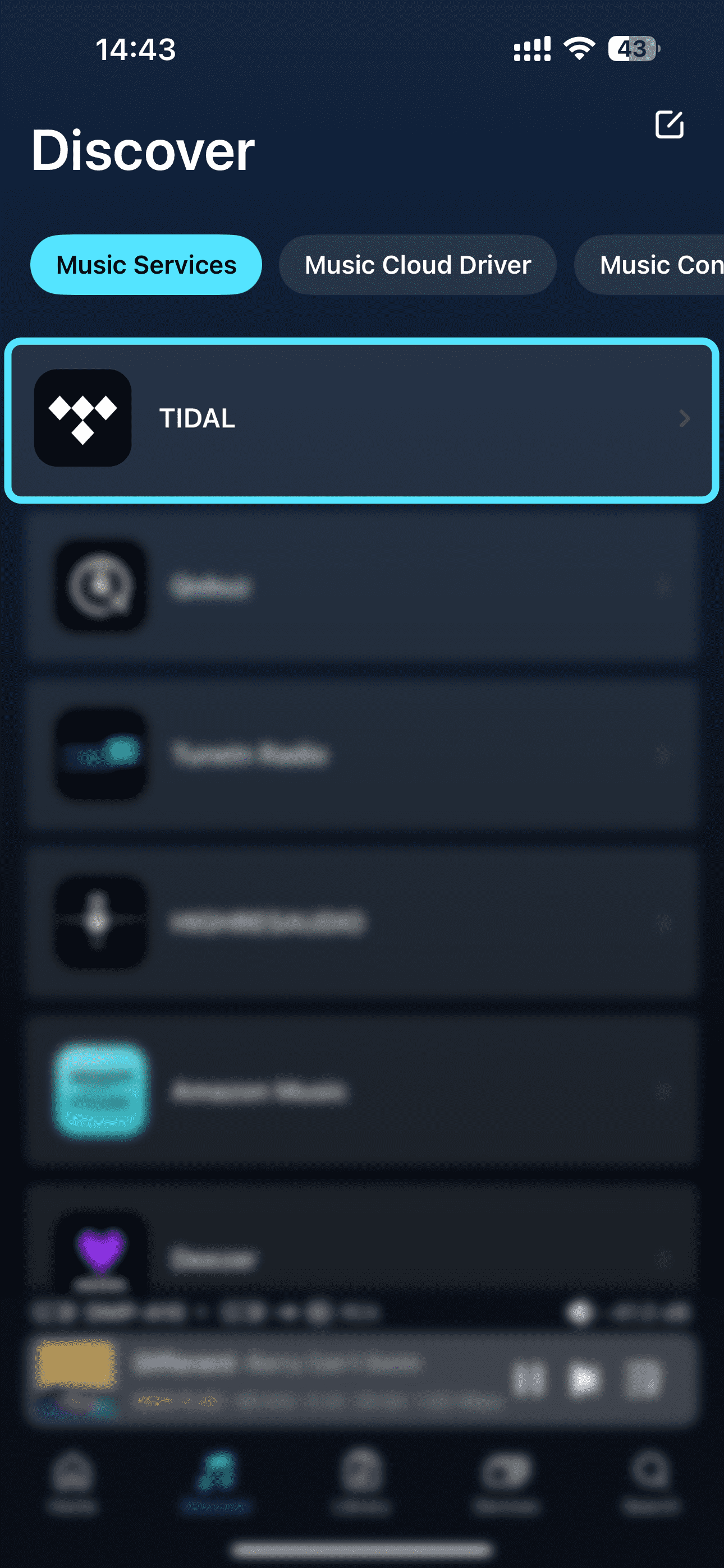 For first-time login, open TIDAL on your device under "Streaming" - "Music", or open it in the Eversolo Control app under "Discover" - "Music Services". Follow the on-screen prompts to complete login.