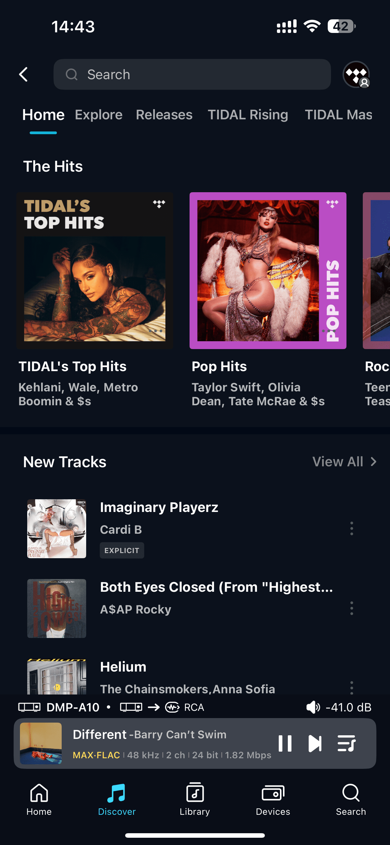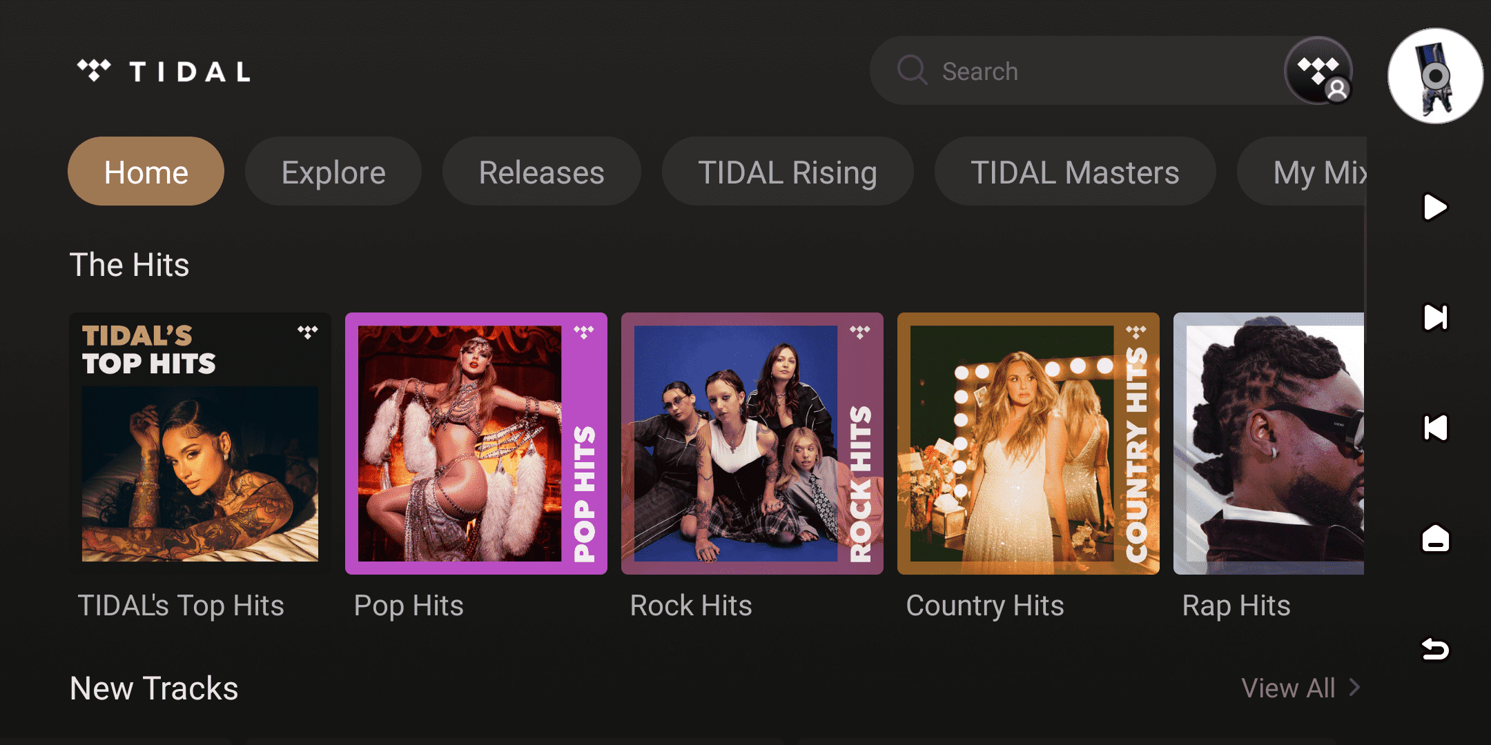 After successfully logging in, you can browse TIDAL music on your device or in the Eversolo Control app. At the top of the interface, you will see sections for Home, Explore, Releases, TIDAL Rising, TIDAL Masters, My Mix, Playlists, Genres, and My Collection.