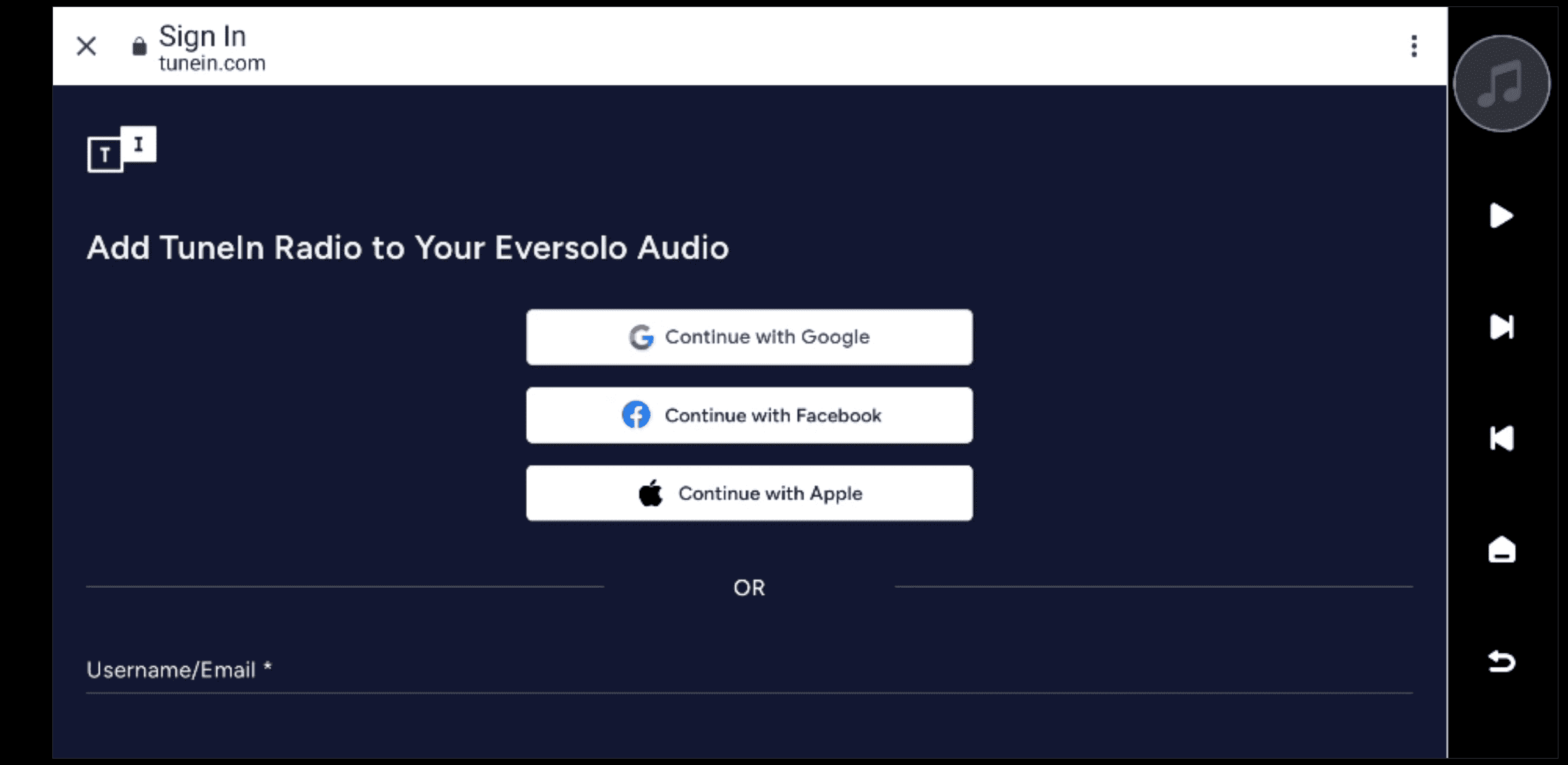 Enter your TuneIn Radio account and password on your device or in the Eversolo Control app to log in.