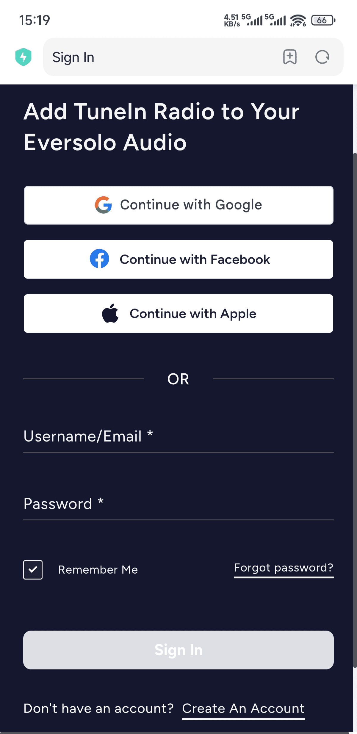 If you haven't created a TuneIn Radio account yet, please click "Create An Account" and follow the prompts to complete the account registration.