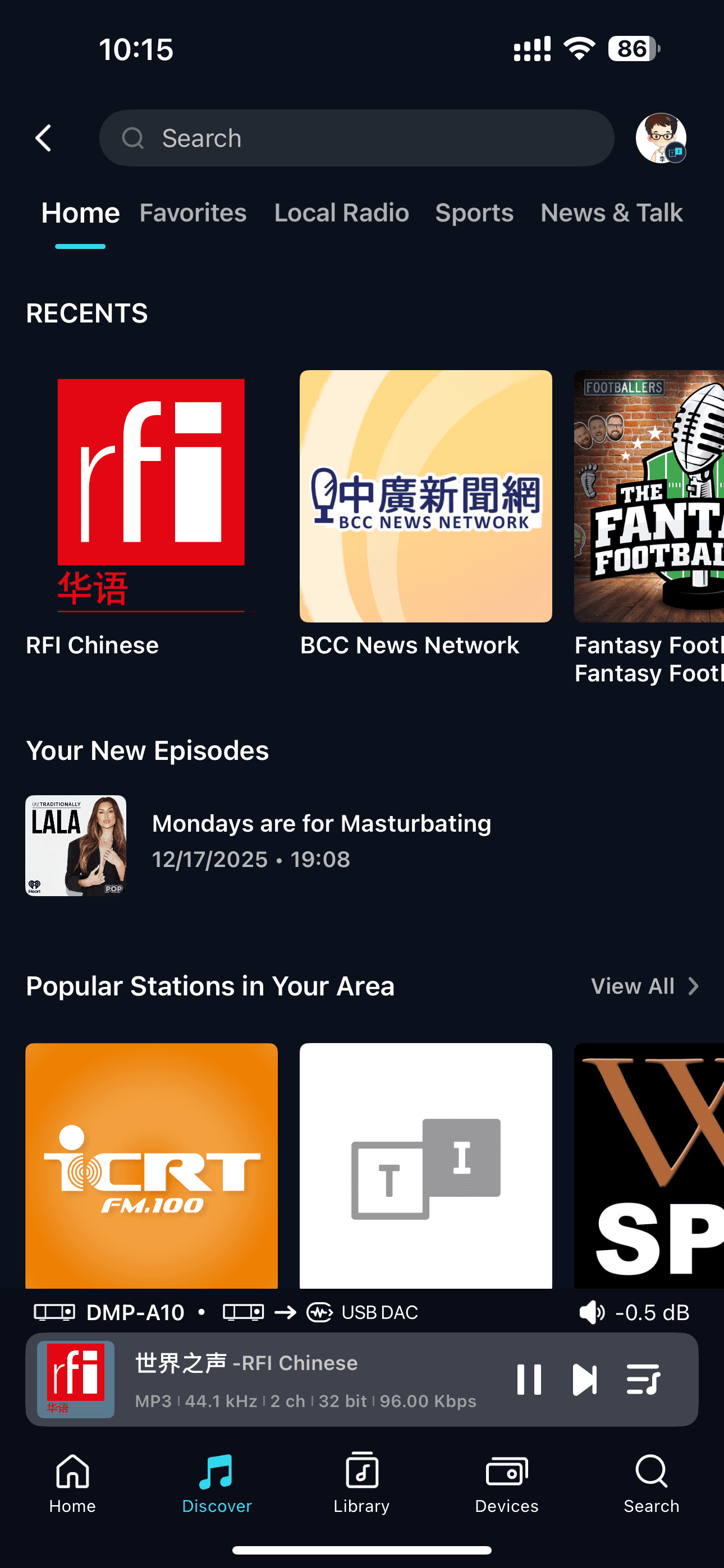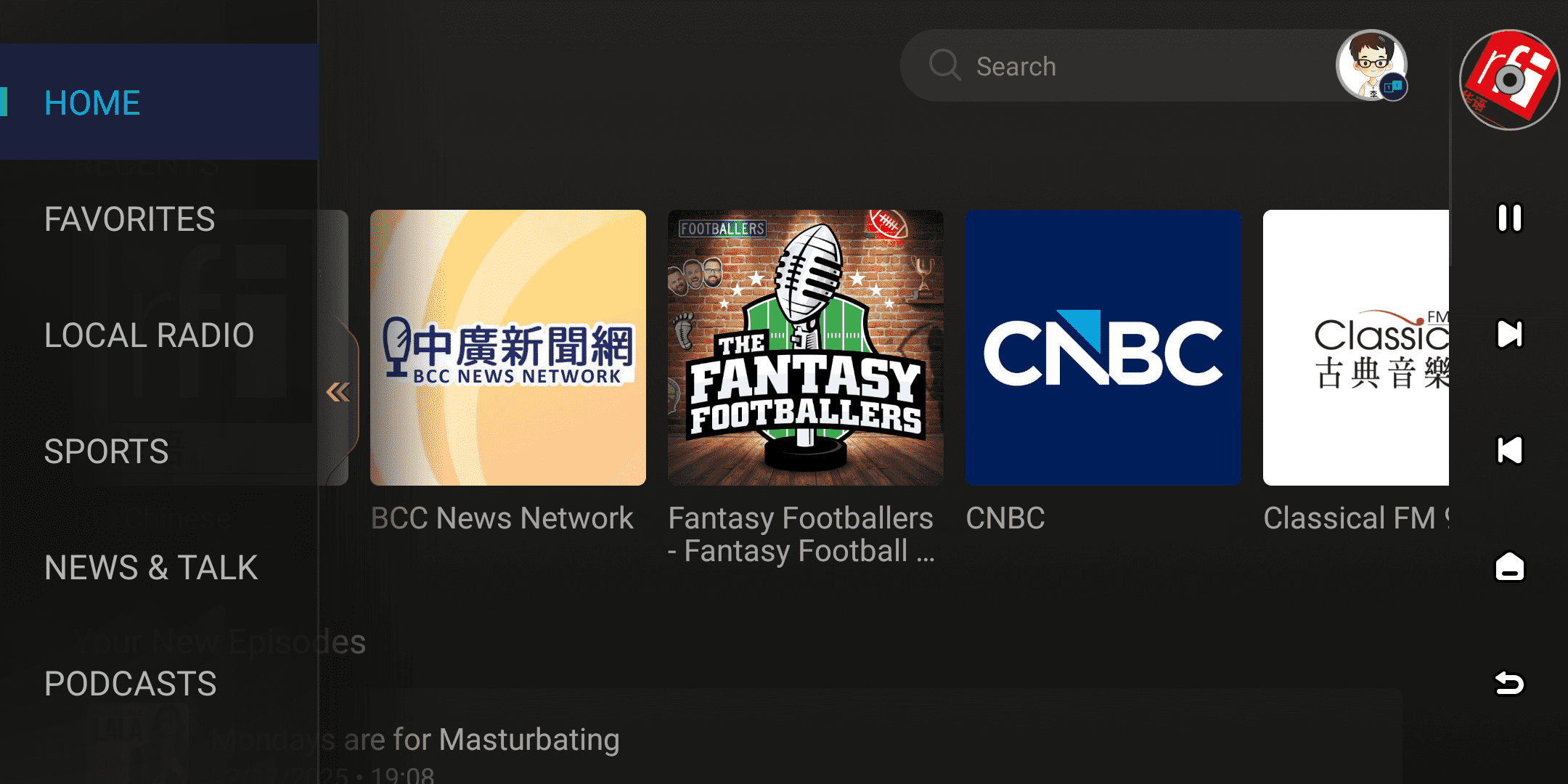 You can browse through each category to explore the rich recommended content offered by TuneIn Radio. Click your account avatar in the upper right corner to view your saved podcasts and radio stations in the "My" section.