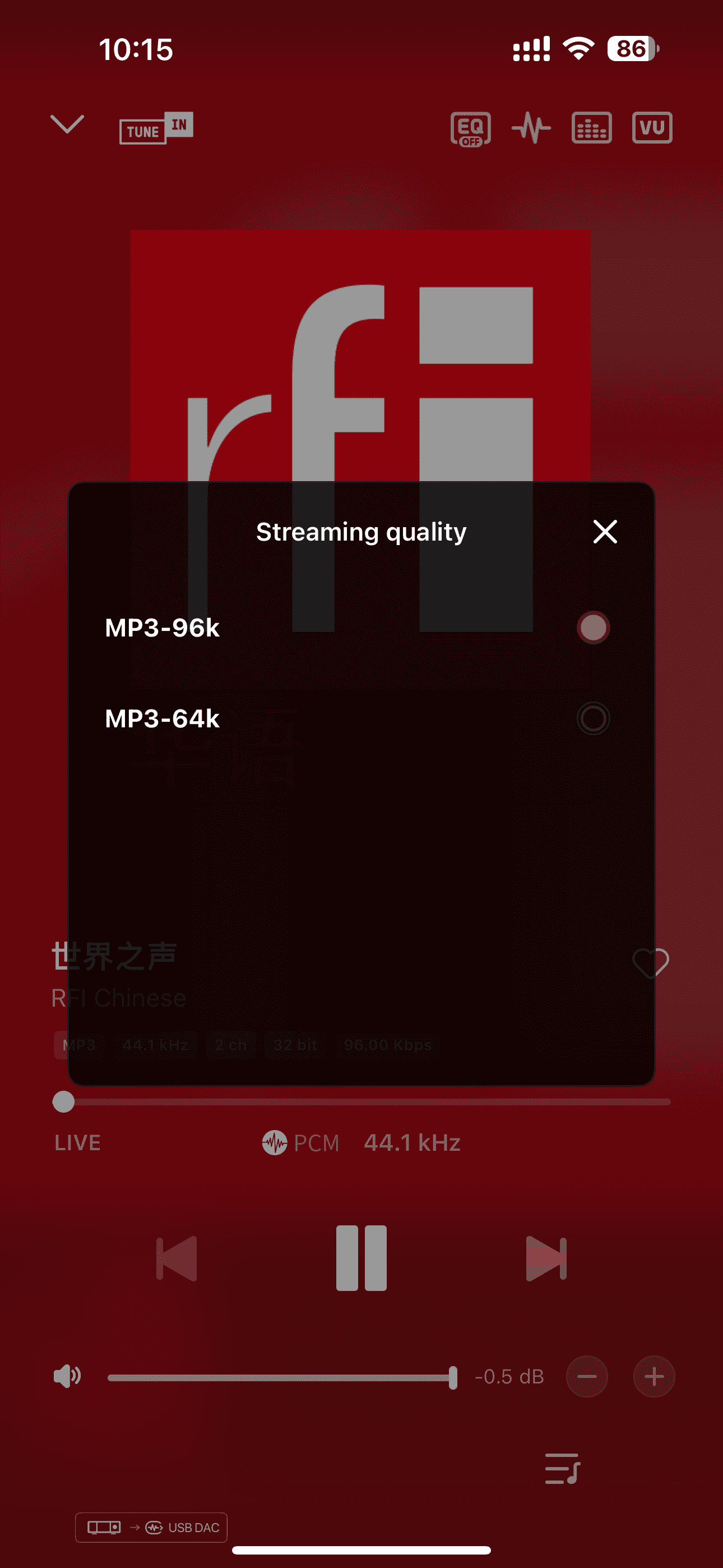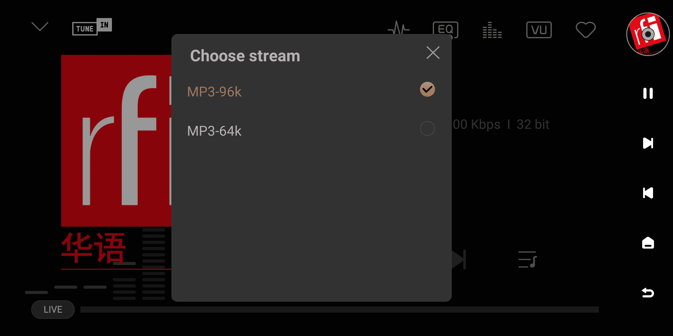 ” icon on the playback details screen to switch the audio stream quality.
